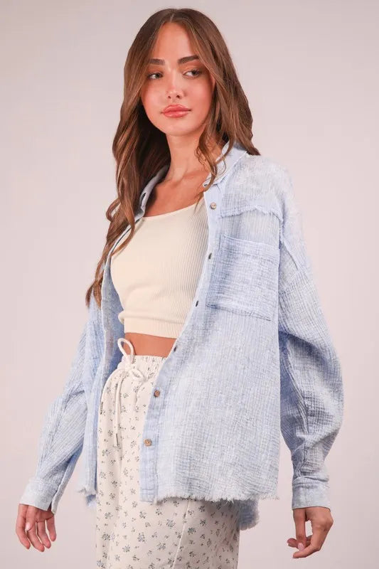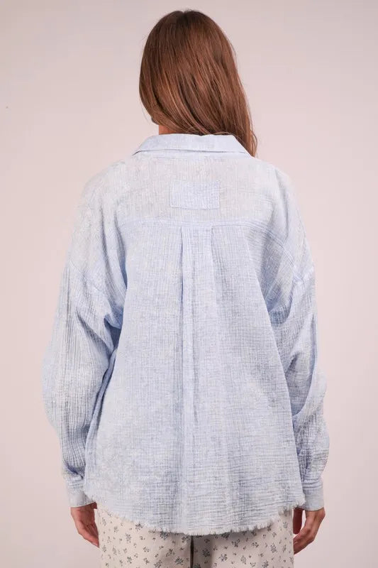 A mineral washed gauze shirt top has a soft, vintage look. It is lightweight and perfect for casual outfits. Pair it with jeans or skirts for a stylish, relaxed look.